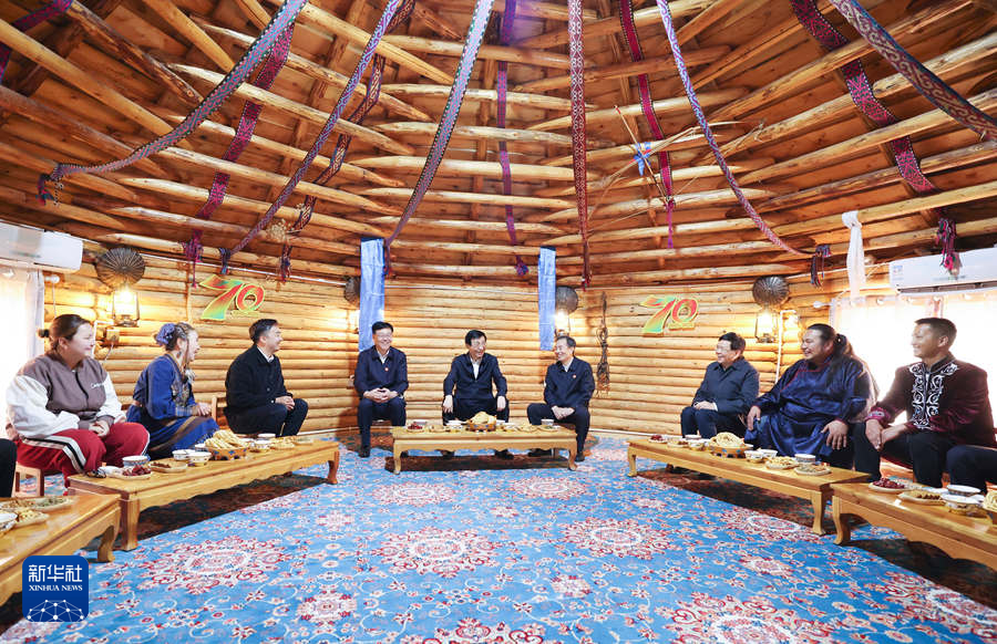 9月27日,受习近平总书记嘱托,中共中央政治局常委、全国政协主席、中央代表团团长王沪宁带领中央代表团部分成员到阿勒泰地区布尔津县考察。这是王沪宁和中央代表团部分成员在扎拉特乡村旅游专业合作社同村民交流。新华社记者 姚大伟 摄